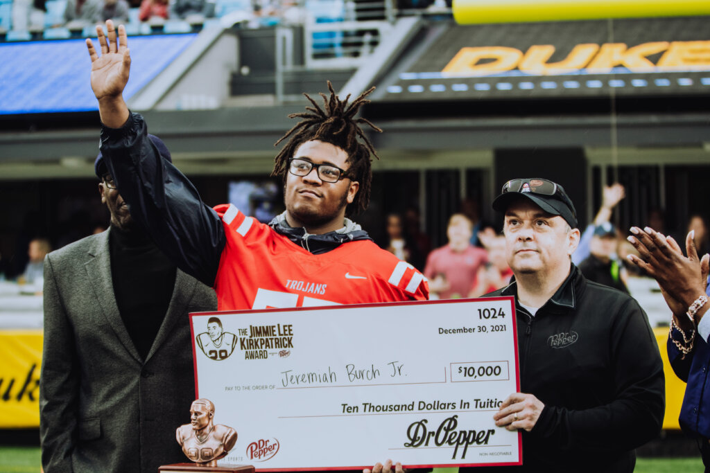 The Jimmie Lee Kirkpatrick Award presented by Dr Pepper will be given annually by the Charlotte Sports Foundation (CSF) to a senior football player from Charlotte-Mecklenburg Schools (CMS) who displays talent both on the field and a passion for their community. The award, which comes with a $10,000 scholarship, trophy and recognition at the Duke’s Mayo Bowl, is named after Jimmie Lee Kirkpatrick of Myers Park High School.